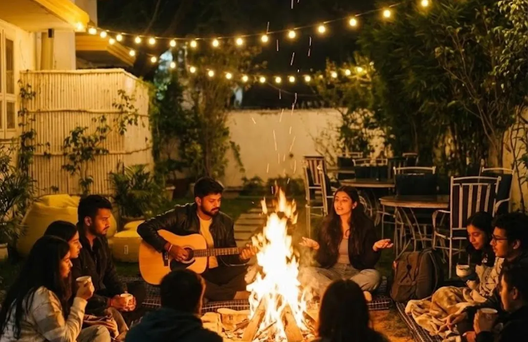 O hostel A Pousada J Startup House - Coliving & Coworking, Jaipur - C Scheme convida os hóspedes a desfrutar de uma sala compartilhada e restaurante.
